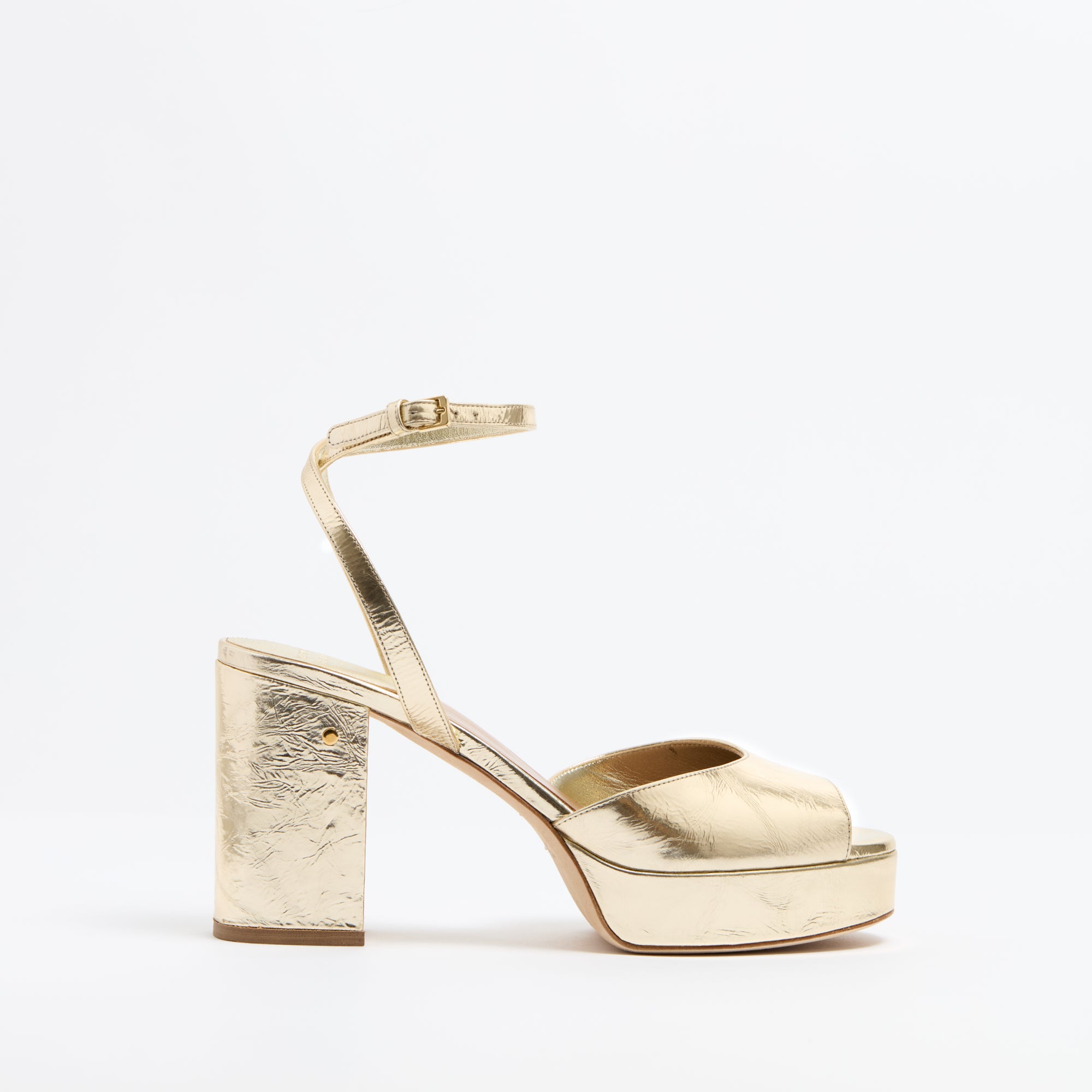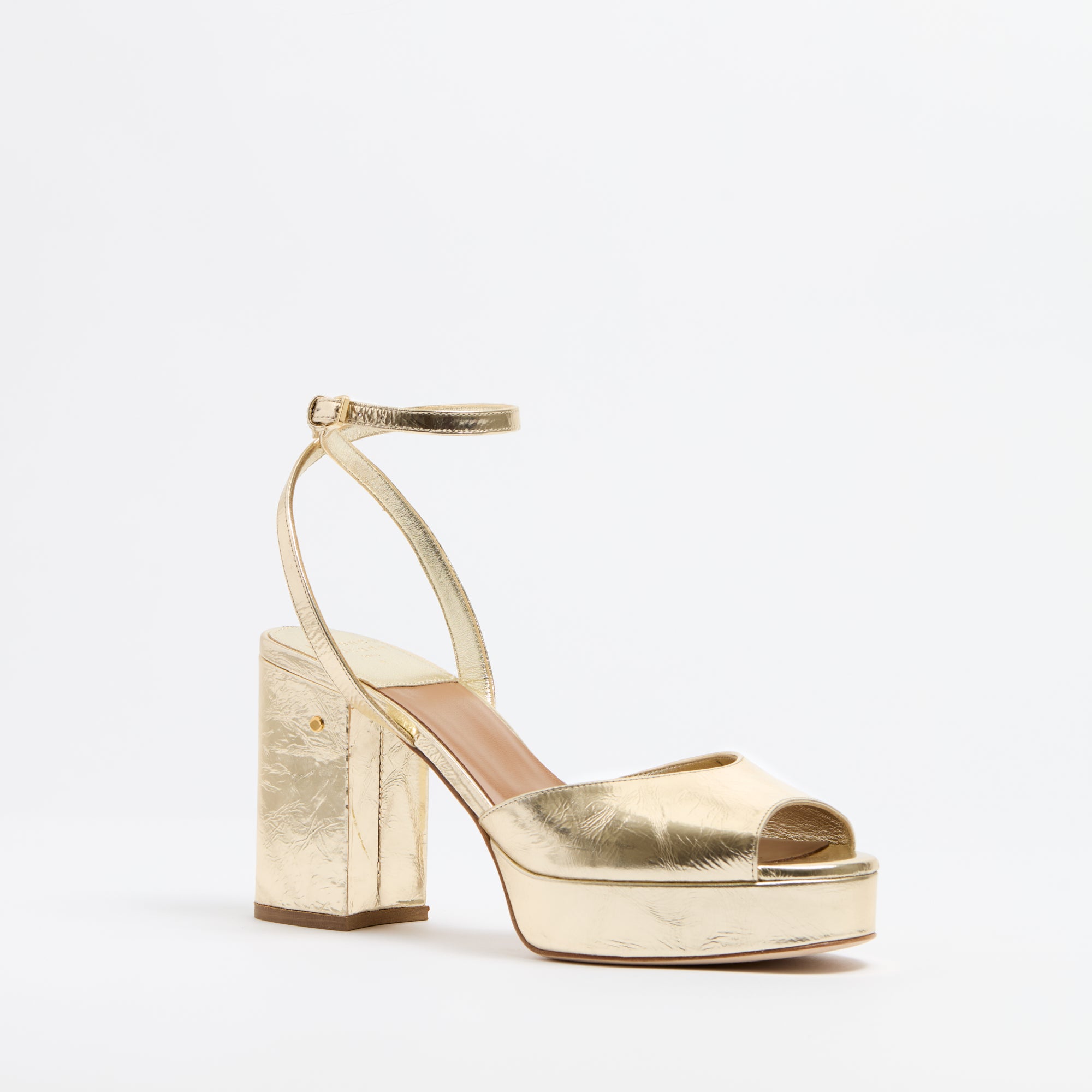 Platform sandals made in platine leather with a block heel balanced by sturdy platform and a delicate ankle strap. The heigh of the platform makes the perfect high heel for an ultimate confort !