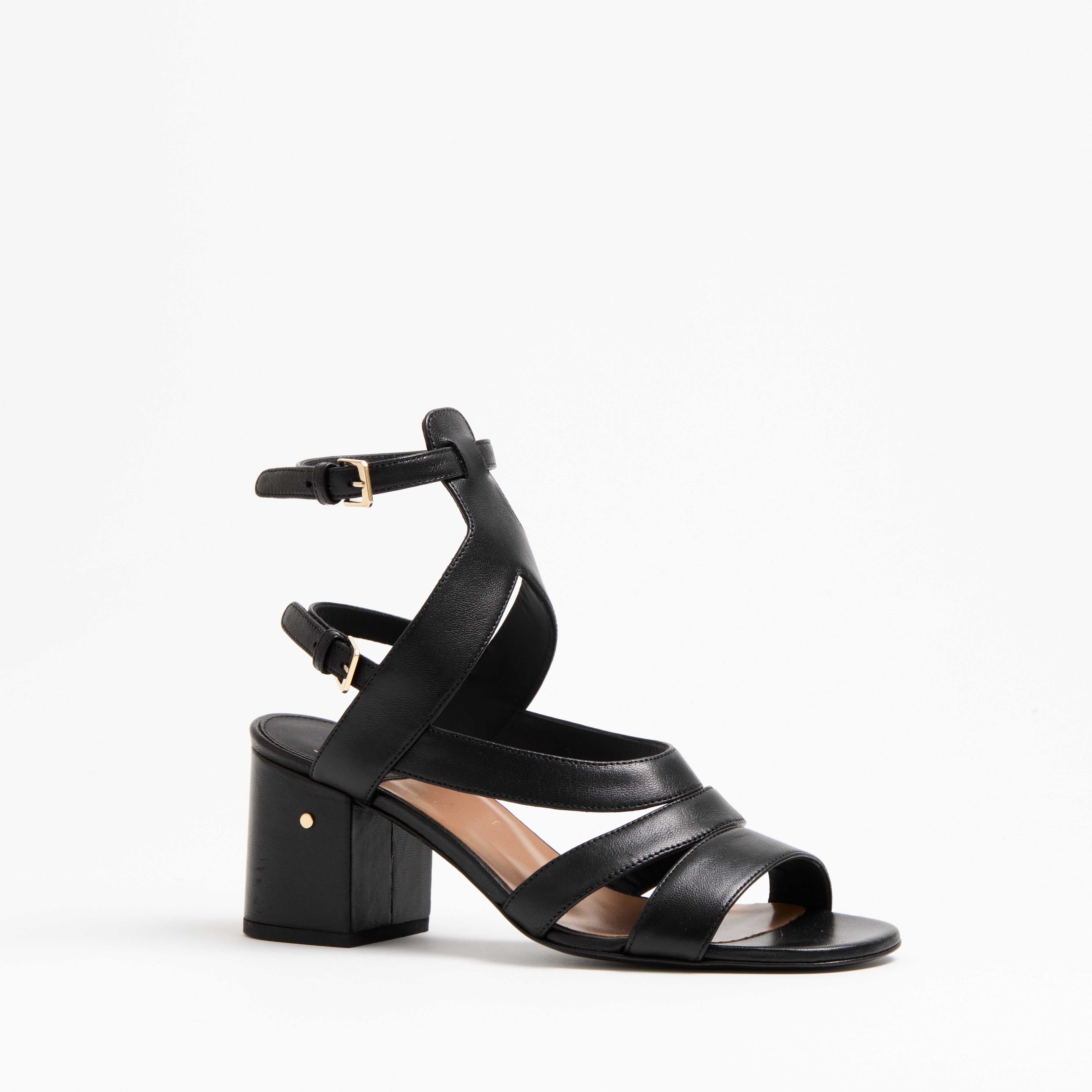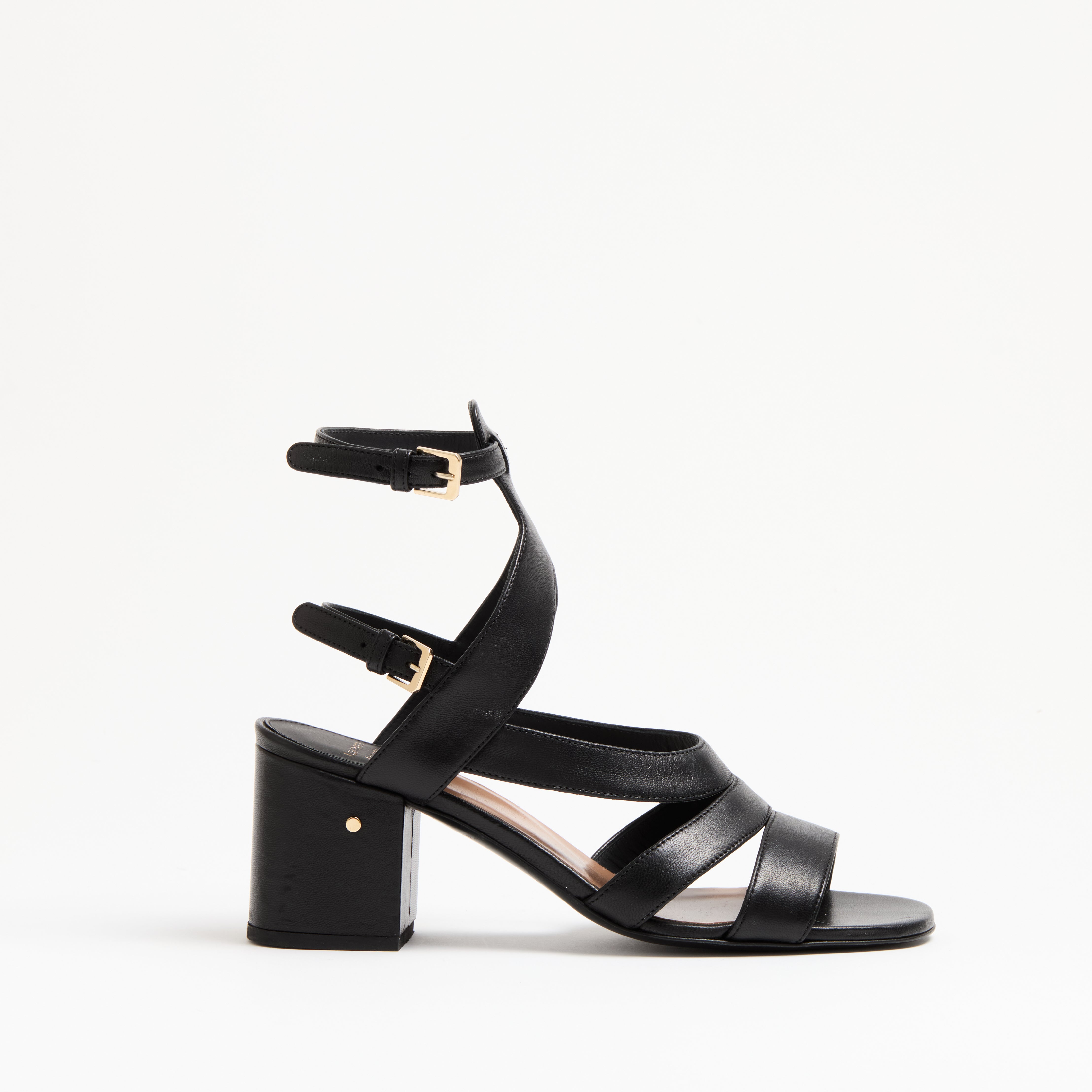 Brides croisées en cuir platine, boucles de cheville dorées et sandales à talon bloc.